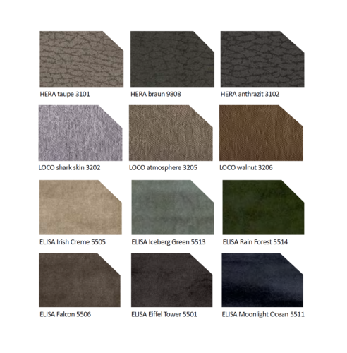 - Bezugsvarianten: Vintage-Microfaser Hera, Weboptik Loko und Vintage-Velours Elisa