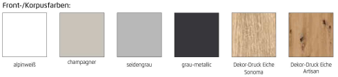 - Front-/ Korpusfarben: Alpinweiß, Champagner, Seidengrau, Grau-Metallic, Dekor-Druck Eiche Sonoma, Dekor-Druck Eiche Artisan