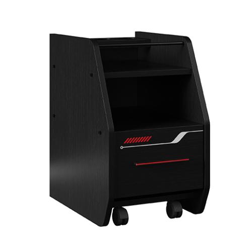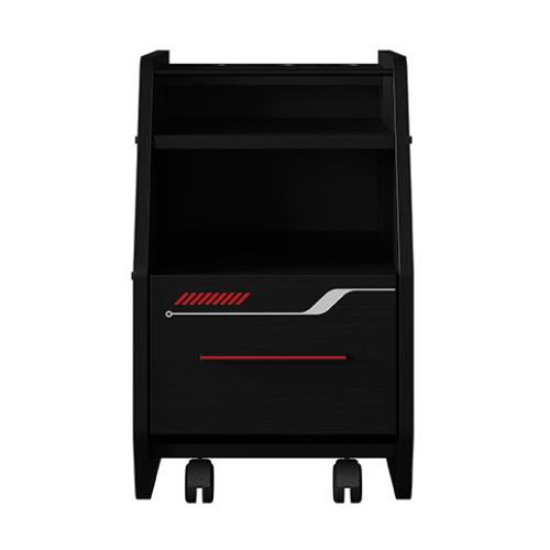 Ausgestattet mit einer Schublade mit Soft-Close-Mechanismus, zwei offenen Fächern sowie einer praktischen Halterung für Dosen, Becher oder Flaschen, sorgt die Kommode für Ordnung und Komfort direkt am Bett oder Gaming-Platz. Der Holzgriff rundet das Design stilvoll ab.