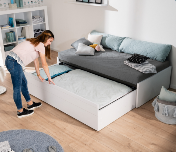 - Beide Liegen inkl. Federleistenrost mit 26 (Hauptliege) bzw. 24 (ausziehbare Liege) schichtverleimten Federleisten