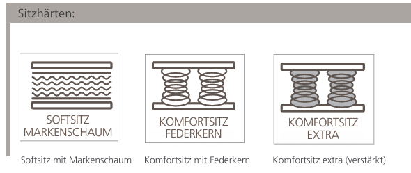 Softsitz mit Markenschaum, Komfortsitz mit Federkern oder Komfortsitz extra (verstärkt).