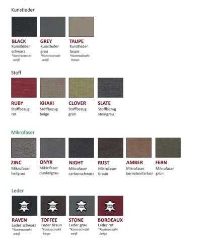 • Bezüge: Leder, Kunstleder, Mikrofaser oder Textilgewebe