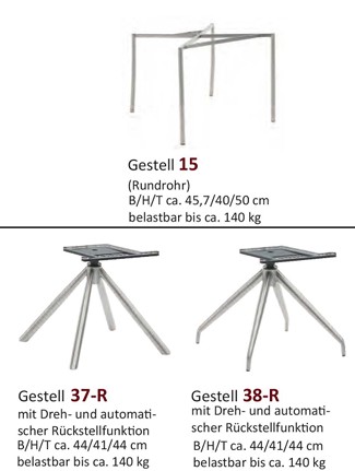 Moderne Gestellvarianten: Für maximale Beweglichkeit sorgen die Gestelle 37-R und 38-R mit integrierter Drehfunktion und automatischer Rückstellfunktion. Alternativ steht das puristische Rundrohr-Gestell 15 für eine klare Linienführung zur Verfügung. Alle Gestelle sind bis zu 140 kg belastbar.