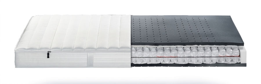 Im Inneren sorgt ein verstärkter 7-Zonen-Tonnentaschenfederkern mit ca. 480 Federn für eine exzellente Unterstützung. Die beidseitige, ca. 3 cm hohe Polsterauflage aus gelochtem AQUAPUR®-Schaum (RG 50 kg/m³) bietet eine punktgenaue Druckentlastung und hohe Langlebigkeit.