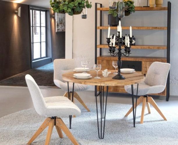 Dank seines Durchmessers von 105 cm eignet sich der Tisch auch für kleinere Essbereiche oder Küchen, ohne dabei an Komfort einzubüßen. Durch seine interessante und dennoch neutrale Farbgebung fügt sich das Möbelstück mühelos in verschiedenste Einrichtungsstile ein – von modern über Industrial bis hin zu natürlich-rustikalen Wohnwelten.