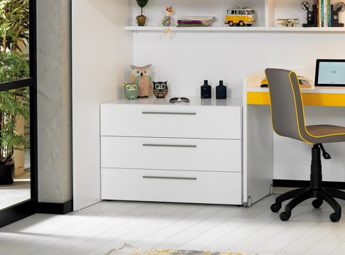 Die Kommode verfügt über 3 leichtgängige Schubladen, die ausreichend Platz für Kleidung, Spielsachen oder Alltagsgegenstände bieten. Besonders praktisch: Sie ist so konzipiert, dass sie unterhalb des Hochbetts Neo positioniert werden kann – eine platzsparende Lösung, die Ordnung und Übersicht schafft.
