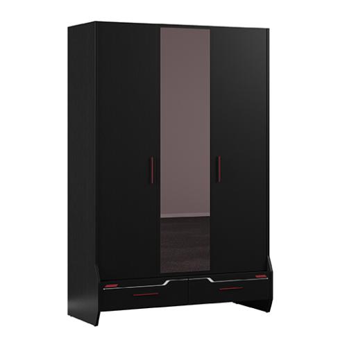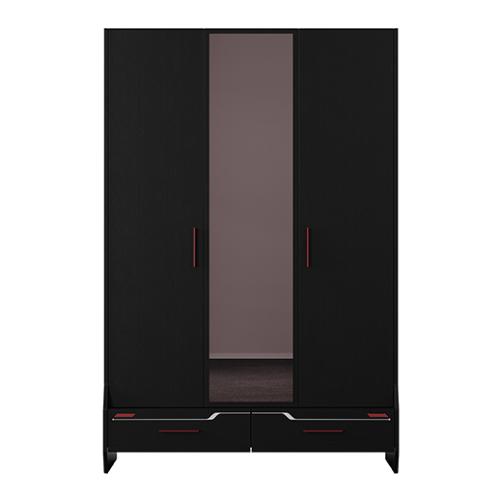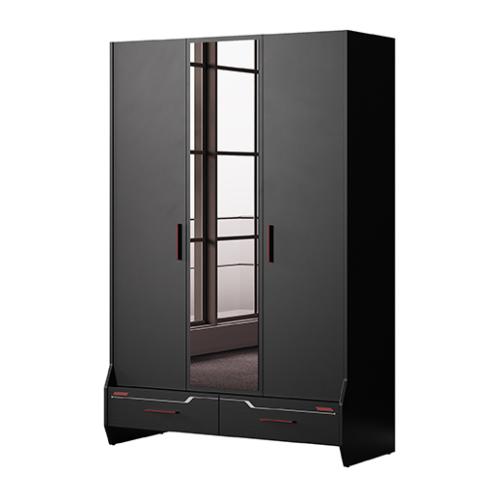 Der 3-türige Kleiderschrank Roox aus der Kinderkollektion Almila vereint modernes Gaming-Design mit durchdachter Funktionalität. Gefertigt aus melaminbeschichteter Spanplatte mit ABS-Kante in Schwarz und mit stilvollen Akzenten in Weiß, Grau oder Rot, ist er ein stylisches Highlight für Jugend- und Gaming-Zimmer.