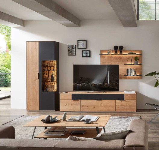 - Absetzung für Vitrinenausschnitt: Wildeiche Echtholzfurnier carbonfarbig lackiert oder Kaminholzoptik